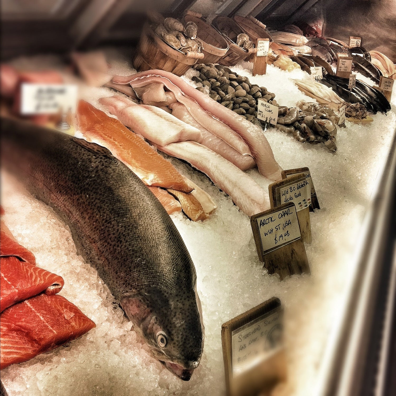A seasonal selection of fresh fish, oysters, clams, mussels. lobster, crab and shrimp ...